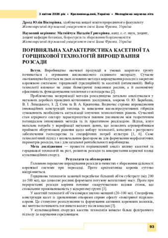 Дрозд Ю. В. (2026) Порівняльна характеристика касетної та горщикової технологій вирощування розсади. In: X Міжнародна студентська наукова конференція «Модернізація та сучасні українські і світові наукові дослідження», 3 квітня 2026 р., Кропивницький. С. 93–94. DOI: 10.62732/liga-inter-03.04.2026.
