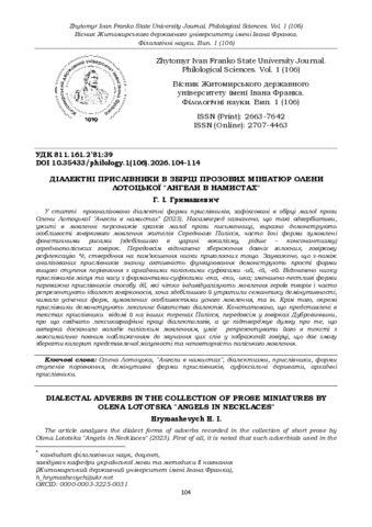| ДСТУ 8302:2015: | Гримашевич Г. І. Діалектні прислівники в збірці прозових мініатюр Олени Лотоцької «Ангели в намистах». Вісник Житомирського державного університету імені Івана Франка. Філологічні науки. 2026. № 106. С. 104–114. DOI: 10.35433/philology.1(106).2026.104-114. |