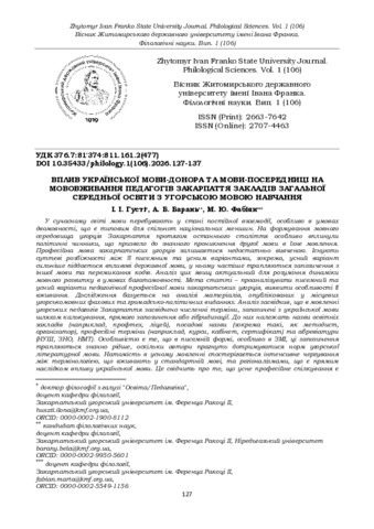 ДСТУ 8302:2015: Густі І. І., Барань А. Б., Фабіян М. Ю. Вплив української мови на мововживання педагогів Закарпаття закладів загальної середньої освіти з угорською мовою навчання. Вісник Житомирського державного університету імені Івана Франка. Філологічні науки. 2026. № 106. С. 127–137. DOI: 10.35433/philology.1(106).2026.127-137.