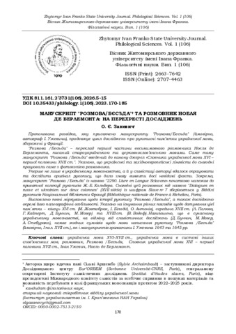 | ДСТУ 8302:2015: | Заневич О. Є. Манускрипт «Розмова / Бєсѣда» та розмовник Ноеля де Берлемонта: на перехресті досліджень. Вісник Житомирського державного університету імені Івана Франка. Філологічні науки. 2026. № 106. С. 170–185. DOI: 10.35433/philology.1(106).2023.170-185. |
