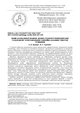 | ДСТУ 8302:2015: | Харчук Л. В., Сухенко В. Г. Межі дозволеної правди: мовні стратегії репрезентації голодомору в регіональних офіційно-ділових текстах Сумщини. Вісник Житомирського державного університету імені Івана Франка. Філологічні науки. 2026. № 106. С. 237–248. DOI: 10.35433/philology.1(106).2026.237-248. |