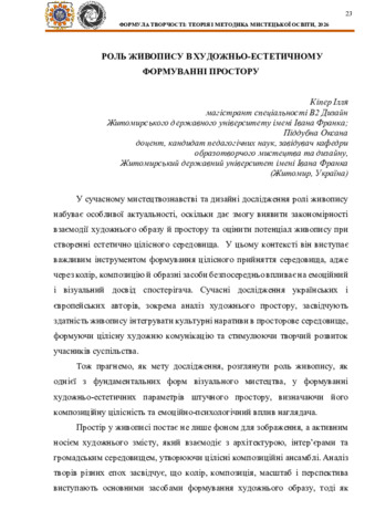 У статті розглядається роль живопису як фундаментальної форми візуального мистецтва у художньо-естетичному формуванні штучного простору. Автори обґрунтовують актуальність дослідження в контексті сучасного мистецтвознавства та дизайну, підкреслюючи, що живопис через колір, композицію, масштаб, перспективу та ритм виступає не лише декоративним засобом, а й стратегічним інструментом створення естетично цілісного, емоційно насиченого середовища.