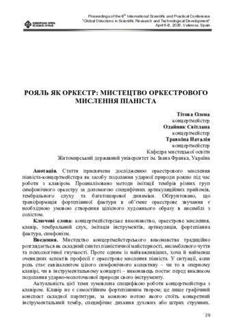 У статті досліджується оркестрове мислення піаніста-концертмейстера як ключовий засіб подолання ударної природи роялю під час роботи з клавіром. Автори аналізують методи імітації тембрів різних груп симфонічного оркестру (струнні, дерев’яні та мідні духові, ударні) за допомогою специфічних артикуляційних прийомів, тембрального слуху, педалізації та багатошарової динаміки.