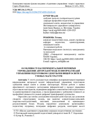 Особливості експериментальної перевірки упровадження авторської моделі інформатизації управління підготовкою здобувачів вищої освіти в умовах магістратури.