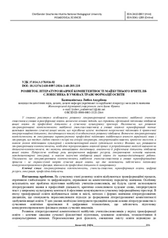 | Ключові слова: | літературознавча компетентність, учитель-словесник, трансформація освіти, цифрові ресурси, інтеграція, професійна діяльність |