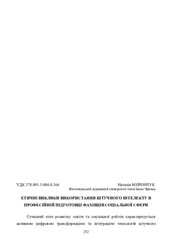 У статті розглядаються етичні виклики використання штучного інтелекту (ШІ) в професійній підготовці фахівців соціальної сфери. Авторка аналізує процес цифрової трансформації освіти та соціальної роботи, поширення інструментів ШІ в навчальному процесі, дослідницькій діяльності, аналітичній роботі та консультативній практиці.