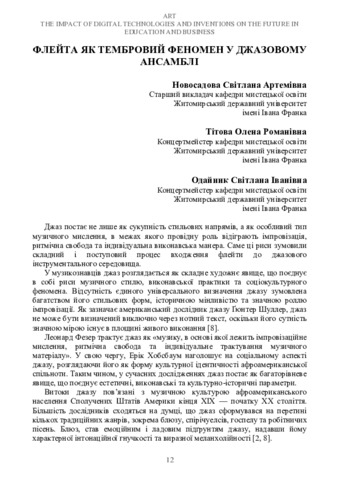 Новосадова С. А.ORCID: https://orcid.org/0000-0003-2937-8958, Тітова О. Р.ORCID: https://orcid.org/0009-0008-8024-6284, Одайник С. І.ORCID: https://orcid.org/0009-0003-2455-7487 (2026) Флейта як тембровий феномен у джазовому ансамблі. In: XV Міжнародна науково-практична конференція «The impact of digital technologies and inventions on the future in education and business», 13–15 квітня 2026 р., Мюнхен, Німеччина. С. 12–16.