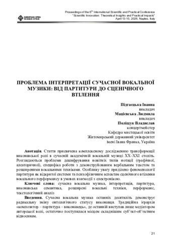Проблема інтерпретації сучасної вокальної музики: від партитури до сценічного втілення.