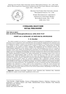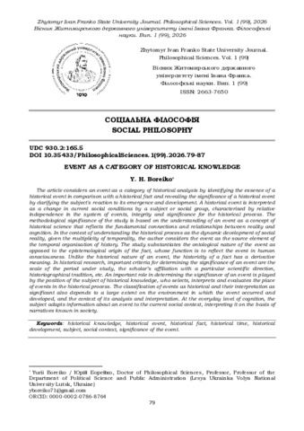 Борейко Ю. Г.ORCID: https://orcid.org/0000-0002-0786-8764 (2026) Event as a Category of Historical Knowledge. Вісник Житомирського державного університету імені Івана Франка. Філософські науки. № 99. С. 79–87. ISSN 2663-7650. DOI: 10.35433/PhilosophicalSciences.1(99).2026.79-87.