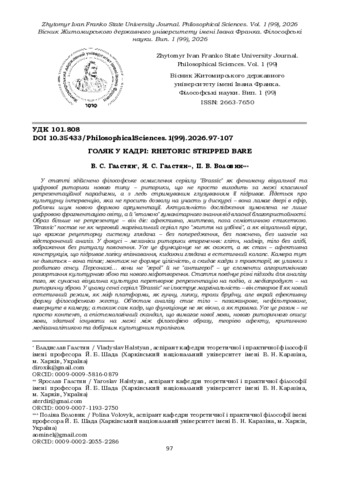ДСТУ 8302:2015: Галстян В. С., Галстян Я. С., Воловик П. В. Голяк у кадрі: Rhetoric Stripped Bare. Вісник Житомирського державного університету імені Івана Франка. Філософські науки. 2026. № 99. С. 97–107. DOI: 10.35433/PhilosophicalSciences.1(99).2026.97-107.