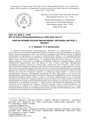 | ДСТУ 8302:2015: | Макаров О. О., Прокопенко В. В. Фантастичний реалізм виключених: риторика абсурду у «Brassic». Вісник Житомирського державного університету імені Івана Франка. Філософські науки. 2026. № 99. С. 108–117. DOI: 10.35433/PhilosophicalSciences.1(99).2026.108-117. |