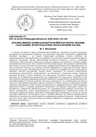 Мельничук М. С.ORCID: https://orcid.org/0000-0002-4299-968X (2026) Духовні виміри діджіталізації релігійної культури людини сьогодення: культурологічно-філософський погляд. Вісник Житомирського державного університету імені Івана Франка. Філософські науки. № 99. С. 118–126. ISSN 2663-7650. DOI: 10.35433/PhilosophicalSciences.1(99).2026.118-126.