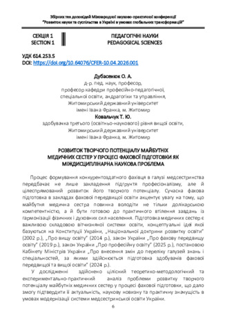 Розвиток творчого потенціалу майбутніх медичних сестер у процесі фахової підготовки як міждисциплінарна наукова проблема.
