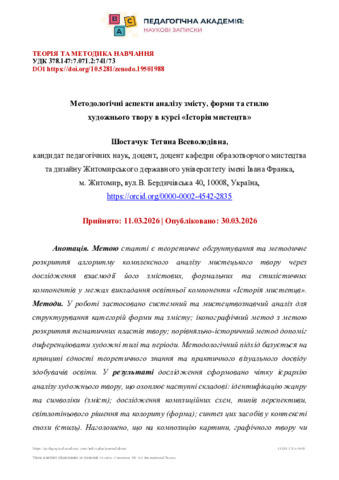 Метою статті є теоретичне обгрунтування та методичне розкриття алгоритму комплексного аналізу мистецького твору через дослідження взаємодії його змістових, формальних та стилістичних компонентів у межах викладання освітньої компоненти «Історія мистетцв». Методи. У роботі застосовано системний та мистецтвознавчий аналіз для структурування категорій форми та змісту; іконографічний метод з метою розкриття тематичних пластів твору; порівняльно-історичний метод допоміг диференціювати художні тилі та періоди. Методологічний підхід базується на принципі єдності теоретичного знання та практичного візуального досвіду здобувачів освіти. У результаті дослідження сформовано чітку ієрархію аналізу художнього твору, що охоплює наступні складові: ідентифікацію жанру та символіки (зміст); дослідження компзиційних схем, типів перспективи, світлотіньового рішення та колориту (форма); синтез цих засобів у контексті епохи (стиль). Наголошено, що на композицію картини, графічного твору чи скульптруи безпосередньо впливає образотворче поле, тобто форма опори або архітектурний простір, що визначає зовнішню композицію твору. Встановлено, що категорія кольору включає поняття колірної домінанти, яка привертає увагу глядача, та колірного акценту, невеликої плями, що відрізняється від основного тону. Доведено, що розуміння «композиційного центру» та «геометричного центру», а також розрізнення типів фактур (імпасто, fini, non finito) є критично важливими для формування професійних компетенцій майбутніх спеціалістів в сфері мистетцва. Обгрунтовано перехад від жорсткої стилістичної класифікації ХІХ столття до сучасного розуміння сттилю як історичного періоду. Висновки. Впровадження запропонованої методики аналізу змісту, форми та стилю мистецького твору в освітній процес сприяє розвитку в здобувачів освіти навичок цілісного сприйняття мистетцва. Це дозволяє подолати суто описовий підхід і трансформувати знання з історії мистецтв у дієвий інструмент для сучасної творчої практики, де класичні принципи візуальної гармонії адаптуються до вимог художньо-мистецької освіти.