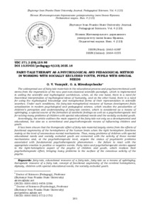 The widespread use of fairy-tale materials in the educational process and psychocorrectional work stems from the imperatives of the new post-non-classical scientific paradigm, which is implemented in uniting the scientific and mythological worldviews, when, on the one hand, there is a need for theoretical interpretation of mythological ideas of humanity, and on the other hand, there is a need for using the mythological knowledge and metaphorical forms of their representation in scientific searches. Under such conditions, the fairy-tale-metaphorical resource of human development finds actualization in modern psychological and pedagogical science, which studies the peculiarities of children’s perception and understanding of fairy-tale content, which is considered as a means of upbringing, a special source of the formation of aesthetic feelings as well as a psychotherapeutic tool for solving many problems of children with special educational needs and the socially excluded youth.