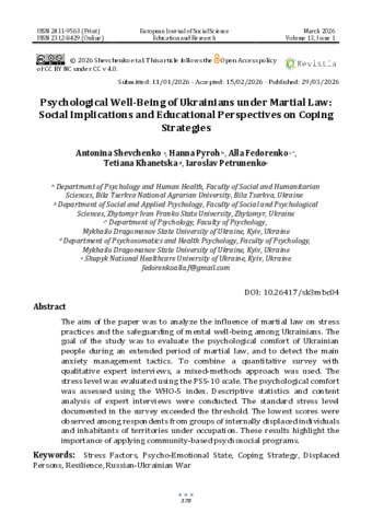 | ДСТУ 8302:2015: | Psychological Well-Being of Ukrainians under Martial Law: Social Implications and Educational Perspectives on Coping Strategies / А. М. Шевченко та ін. European Journal of Social Science Education and Research. 2026. Т. 13, № 1. С. 378–396. DOI: 10.26417/sk3mbc04. |