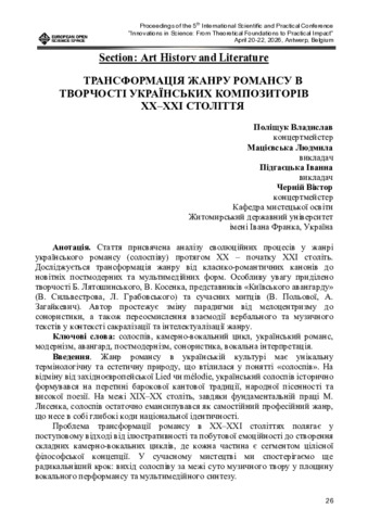 Трансформація жанру романсу в творчості українських композиторів ХХ–ХХІ століття.