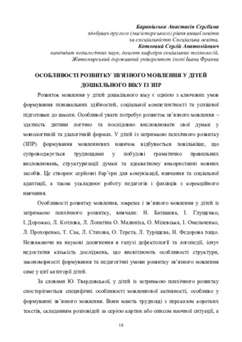 Баранівська А. С., Котловий С. А.ORCID: https://orcid.org/0000-0001-7724-9398 (2026) Особливості розвитку звʼязного мовлення у дітей дошкільного віку із ЗПР. In: XII Всеукраїнська науково-практична конференція «Спеціальна та інклюзивна освіта: теорія, методика, практика», 26 березня 2026 р., Умань. С. 18–21.