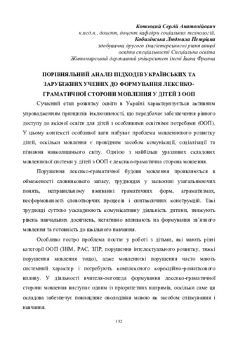 Котловий С. А.ORCID: https://orcid.org/0000-0001-7724-9398, Кобилінська Л. П. (2026) Порівняльний аналіз підходів українських та зарубіжних учених до формування лексико-граматичної сторони мовлення у дітей з ООП. In: XII Всеукраїнська науково-практична конференція «Спеціальна та інклюзивна освіта: теорія, методика, практика», 26 березня 2026 р., Умань. С. 152–156.