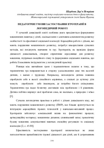 Щербина Д. П. (2026) Педагогічні умови застосування ігротерапії в логопедичній роботі. In: XII Всеукраїнська науково-практична конференція «Спеціальна та інклюзивна освіта: теорія, методика, практика», 26 березня 2026 р., Умань. С. 354–358.