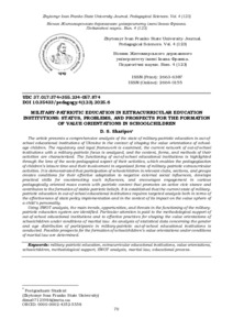 У статті представлено комплексний аналіз стану військово-патріотичного виховання у позашкільних навчальних закладах України в контексті формування ціннісних орієнтацій дітей шкільного віку. Розглянуто нормативно-правову базу, проаналізовано сучасну мережу позашкільних закладів військово-патріотичного спрямування, охарактеризовано зміст, форми та методи їхньої діяльності. Функціонування позашкільних навчальних закладів висвітлено крізь призму соціально-педагогічного аспекту їхньої діяльності, що дає змогу педагогізувати дозвілля дітей та залучати їх до організованих форм військово-патріотичної позакласної діяльності. Показано, що участь школярів у відповідних гуртках, секціях та групах створює умови для їх ефективної адаптації до негативних зовнішніх соціальних впливів, розвиває практичні навички протидії таким впливам, заохочує до участі в різноманітних педагогічно спрямованих масових заходах з патріотичним змістом, що сприяють активній громадянській позиції та формуванню стійких патріотичних переконань. Встановлено, що сучасний стан військово-патріотичного виховання у позашкільних навчальних закладах потребує цілеспрямованого аналізу як з точки зору ефективності реалізації державної політики, так і в контексті її впливу на ціннісну сферу особистості дитини.