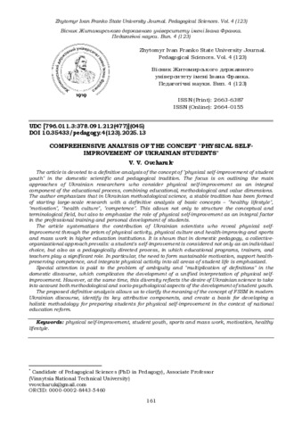 У статті систематизовано внесок українських науковців, які розкривають фізичне самовдосконалення крізь призму фізичної активності, фізичної культури та оздоровлення та спортивно-масової роботи у вищих навчальних закладах. Показано, що у вітчизняній педагогіці переважає колективно-організаційний підхід: самовдосконалення студента розглядається не лише як індивідуальний вибір, а й як педагогічно спрямований процес, у якому значну роль відіграють освітні програми, тренери, викладачі. Зокрема, наголошується на необхідності формування стійкої мотивації, підтримки здоров'язбережувальної компетентності та інтеграції фізичної активності в усі сфери життя студентів.
