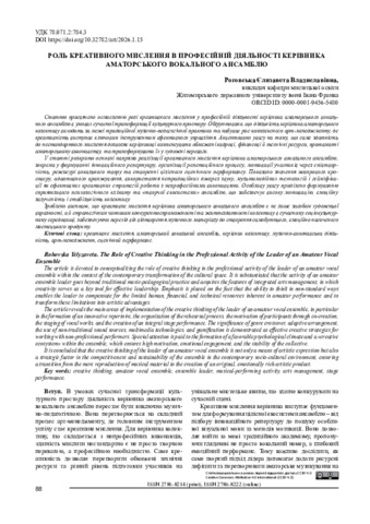 Статтю присвячено осмисленню ролі креативного мислення у професійній діяльності керівника аматорського вокального ансамблю в умовах сучасної трансформації культурного простору. Обґрунтовано, що діяльність керівника аматорського колективу виходить за межі традиційної музично-педагогічної практики та набуває рис комплексного арт-менеджменту, де креативність виступає ключовим інструментом ефективного управління. Акцентовано увагу на тому, що саме здатність до нестандартного мислення дозволяє керівникові компенсувати обмежені кадрові, фінансові й технічні ресурси, притаманні аматорському виконавству, та трансформувати їх у художні переваги. У статті розкрито основні напрями реалізації креативного мислення керівника аматорського вокального ансамблю, зокрема у формуванні інноваційного репертуару, організації репетиційного процесу, мотивації учасників через співтворчість, режисурі вокального твору та створенні цілісного сценічного перформансу. Показано значення жанрового кросоверу, адаптивного аранжування, використання нетрадиційних джерел звуку, мультимедійних технологій і гейміфікації як ефективних креативних стратегій роботи з непрофесійними виконавцями. Особливу увагу приділено формуванню сприятливого психологічного клімату та «творчої екосистеми» ансамблю, що забезпечує високу мотивацію, емоційну залученість і стабільність колективу. Зроблено висновок, що креативне мислення керівника аматорського вокального ансамблю є не лише засобом художньої виразності, а й стратегічним чинником конкурентоспроможності та життєздатності колективу в сучасному соціокультурному середовищі, забезпечуючи перехід від відтворення музичного матеріалу до створення самобутнього, емоційно насиченого мистецького продукту.