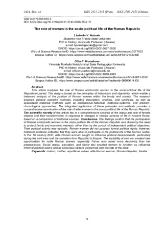 Мета статті – проаналізувати роль римських аристократок у суспільно-політичному житті часів Республіки. Методологічною основою дослідження є принципи історизму, об’єктивності, які дозволили зважено підійти до аналізу становища римлянки в сім’ї та суспільстві. При написанні статті використано загальні наукові методи: опис, аналіз, синтез, а також спеціально-історичні: порівняльно-історичний, історико-системний, проблемно-хронологічний. Комплексне застосування цих принципів та методів забезпечило всебічне дослідження ролі жінки вищого стану в суспільно-політичному житті в Римській Республіці. Наукова новизна статті полягає в комплексному аналізі становища та ролі жінок-громадянок, їх трансформації з урахуванням змін у різних сферах життя Стародавнього Риму на основі співставлення історичних джерел. Висновки. Результати нашої наукової роботи підтверджують, що участь римських аристократок у суспільно-політичному житті Римської Республіки обумовлена необхідністю захисту сімейних, економічних інтересів і не переслідувала власне політичних цілей. Їхня політична діяльність була епізодичною. Римлянки не були наділені політичними правами, але, як свідчать окремі історичні події, вони мали змогу брати участь у політичному житті римської civitas. Зазначено, що в І ст. до н.е. римлянки вищого стану намагалися впливати на політичну ситуацію в державі, особливо в період громадянських воєн, переходу від Республіки до Імперії. Хаос громадянської війни створив нові можливості для знатних римлянок, передовсім Фульвії, яка діяла рішучіше за своїх попередниць. Соціальний статус, освіта, сімейні зв’язки дозволяли жінкам бути потужним “тіньовими” політичними фігурами, свідомими громадянками, що турбувалися про долю держави.